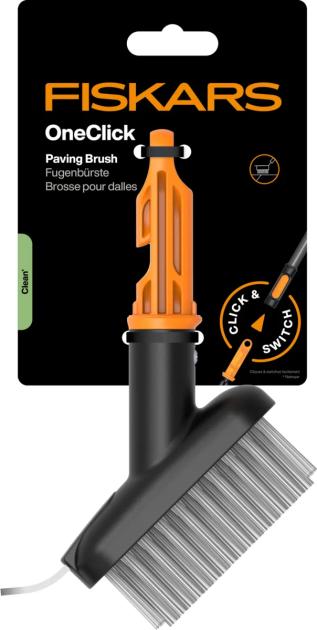 Kartáč na spáry Fiskars OneClick je určen k snadnému odstraňování mechu, plevele a nánosů nečistot z úzkých prostorů mezi dlaždicemi a zámkovou dlažbou.