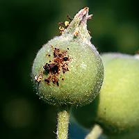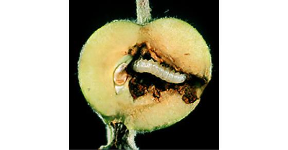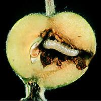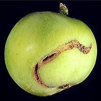 Mladé larvy zpočátku vykusují chodbičku na povrchu mladých plodů, z kterého vzniká charakteristické zkorkovatění na povrchu plodu. Později se larvy prokusují dovnitř plodu a způsobují tzv. červivost plodů.