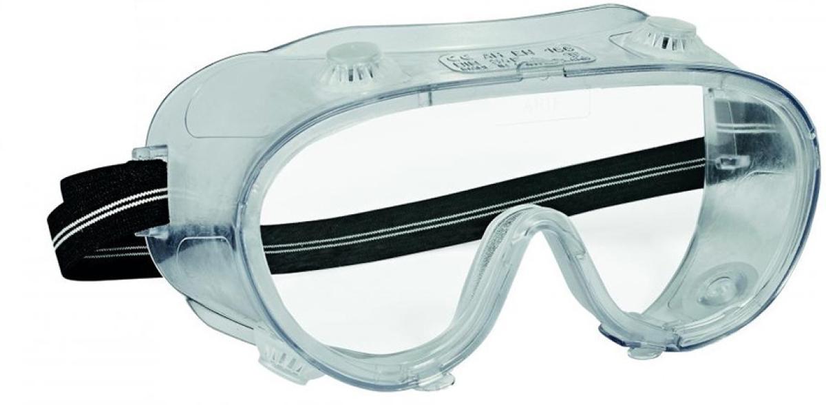 Ochranné brýle s plochým PC zorníkem, měkkou plastovou lícnínou, nepřímo větrané, ochrana před přímo stříkajícími kapalinami, zorník třídy F. Univerzální velikost.