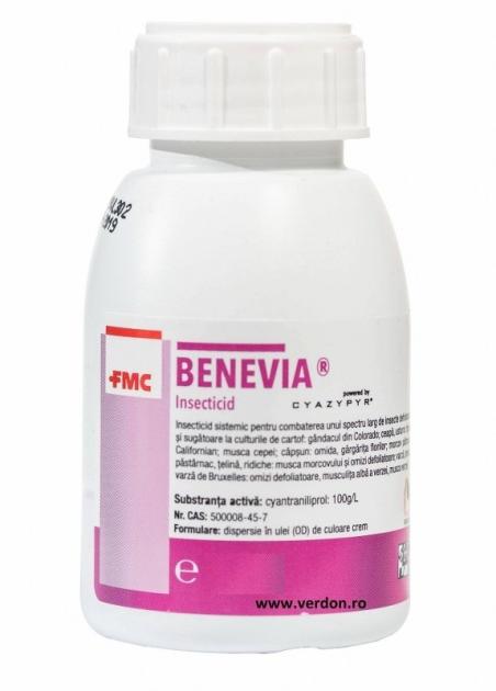 Postřikový insekticid ve formě suspenzního koncentrátu na bázi oleje (OD) určený k ochraně brambor, jahod a zeleniny proti žravým a savým škůdcům. Benevia obsahuje cyantraniliprol, kontaktní a požerový insekticid ze skupiny antranildiamidů s novým mechanismem účinku (IRAC skupina 28). Benevia® aktivuje ryanodinové receptory cílového hmyzu, blokuje svalovou regulaci a způsobuje rychlou paralýzu a úhyn. Expozice toxické dávky vede v důsledku ochrnutí k bezprostřednímu zastavení příjmu potravy (do několika hodin po ošetření) s plným úhynem za 3-6 dní po aplikaci. Benevia® účinkuje ovicidní a ovi-larvicidní a ničí všechna larvální stadia a dospělé jedince citlivých druhů hmyzu. Rychlý nástup účinku znamená vynikající ochranu plodiny proti poškození. Benevia® účinkuje specificky na mšice, molice, třásněnky, housenky motýlů a některé brouky.