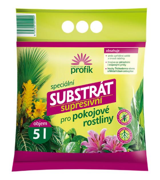 Supresivní substrát pro pokojové rostliny je určen speciálně pro sázení a přesazování všech druhů pokojových rostlin a palem. Je připraven ze směsi vytříděné světlé a tmavé rašeliny s upravenou pH reakcí. Substrát je obohacen hnojivem se základními i stopovými živinami v nezbytném rozsahu, což má příznivý vliv na růst a vývoj