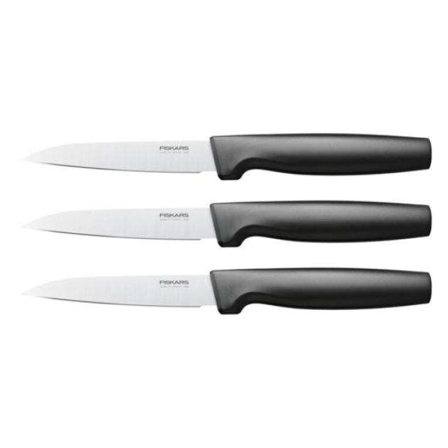 Set obsahuje tři stejné loupací nože Functional Form™ s 8cm ostřím z vysoce kvalitní japonské nerezové oceli pro loupání malého ovoce a zeleniny.